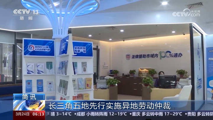 同日,中央廣播電視總臺新聞頻道《朝聞天下》播出《長三角五地先行實施異地勞動仲裁》。